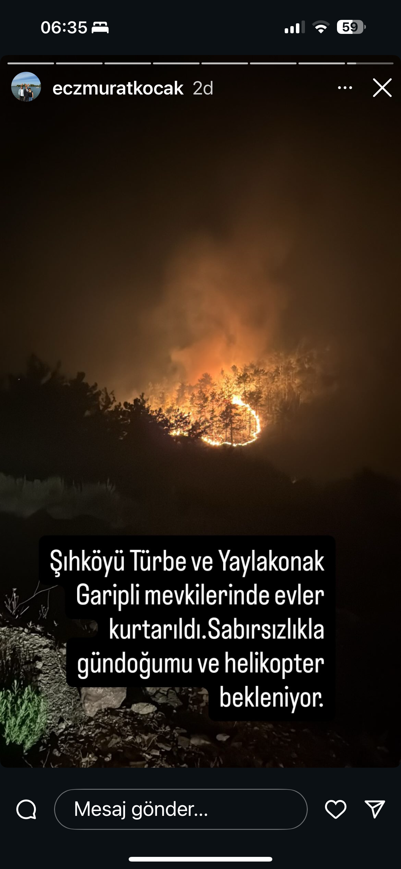 Koçak, sabah saat 06.35’te yaptığı açıklamada yangının Şıhköyü Türbe ve Yaylakonak Garipli mevkilerinde etkili olduğunu belirterek, bölgedeki evlerin kurtarıldığını duyurdu. Koçak ayrıca, sabırsızlıkla gün doğumunun ve yangına havadan müdahale için helikopterlerin beklenildiğini aktardı.