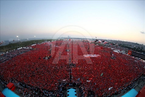 Cumhurbaşkanlığı himayesinde, İstanbul Valiliği ve Büyükşehir Belediyesi desteğiyle Yenikapı Miting Alanı'nda düzenlenen "Demokrasi ve Şehitler Mitingi" boyunca Cumhurbaşkanlığı Halkla İlişkiler Başkanlığı personelince Sultanahmet Camisinin minarelerinde Türk bayrağı dalgalandırıldı. ( Veli Gürgah - Anadolu Ajansı )