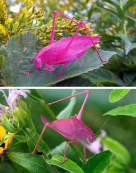 3-) PEMBE ÇEKİRGE Bu hayvanlar doğa ile ahenk içerisinde yaşayan ve bulundukları ortamla uyumlu renklere sahip diğer türlerinden çok daha farklı. Fotomontaj olmayan bu fotoğraflarda da görüldüğü gibi ‘farklı’ renklere sahip bu canlıların düşmanlarından saklanmaları söz konusu bile değil.