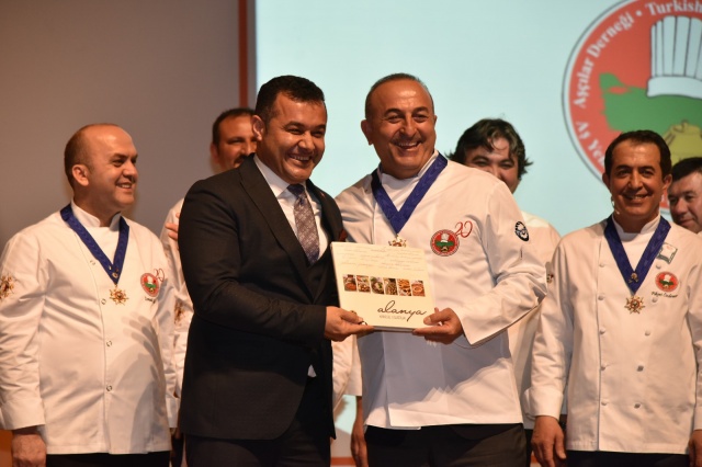 Bakan Çavuşoğlu’nun konuşmasının ardından, Alanya Belediye Başkanı Adem Murat Yücel Bakan Çavuşoğlu'na hazırladıkları Alanya yemekleri kitabını hediye etti.