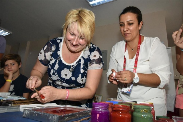 Ebru sanatının tarihçesinin anlatıldığı atölye çalışmasında katılımcılar Türk Bayrağı ve istedikleri bir çok figürü uygulamalı olarak çalıştı.
