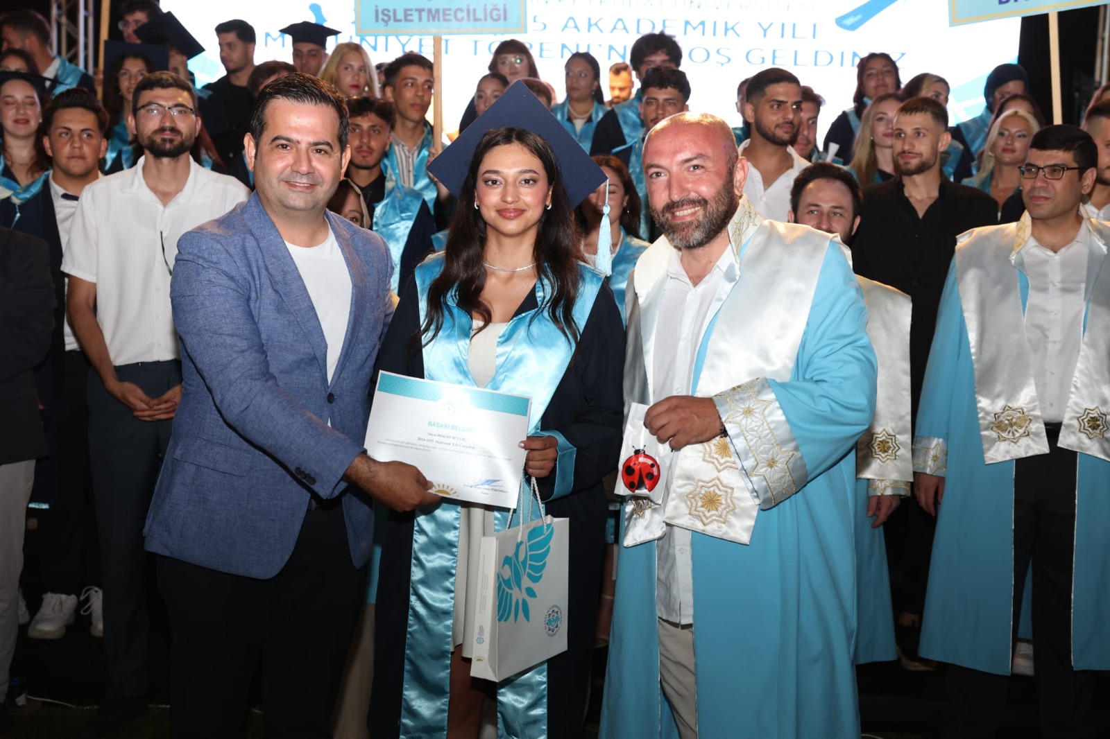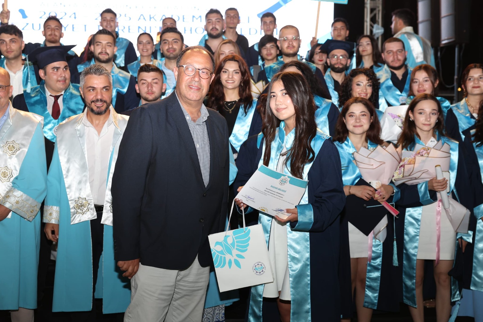 Üniversite ikincisi Turizm Fakültesi Gastronomi ve Mutfak Sanatları bölümünden Büşra Turgut’a ödül ve başarı belgelerini Alanya Belediye Başkan Vekili Faruk Konukçu verdi. Üniversite üçüncüsü Rafet Kayış Mühendislik Fakültesi Bilgisayar Mühendisliği bölümünden Bünyamin Yavuz’a belgelerini Jandarma Albay Engin Burak Mindivanlı verdi. Ödüllerin verilmesinin ardından Rektör Yardımcısı Prof. Dr. Oğuz Karahan öğrencilere mezuniyet yeminini okuttu. Mezuniyet yemini eden öğrenciler büyük bir sevinç ve gururla keplerini havaya atarak mezun oldular. Mezuniyet töreni Gökçe konseri ile devam etti. Öğrenciler ve aileler, konserde gönüllerince eğlenerek mezun olmanın keyfini çıkardılar. Tören sırasında öğrenciler aileleri ve hocalarıyla birlikte bol bol hatıra fotoğrafı çektirdiler.