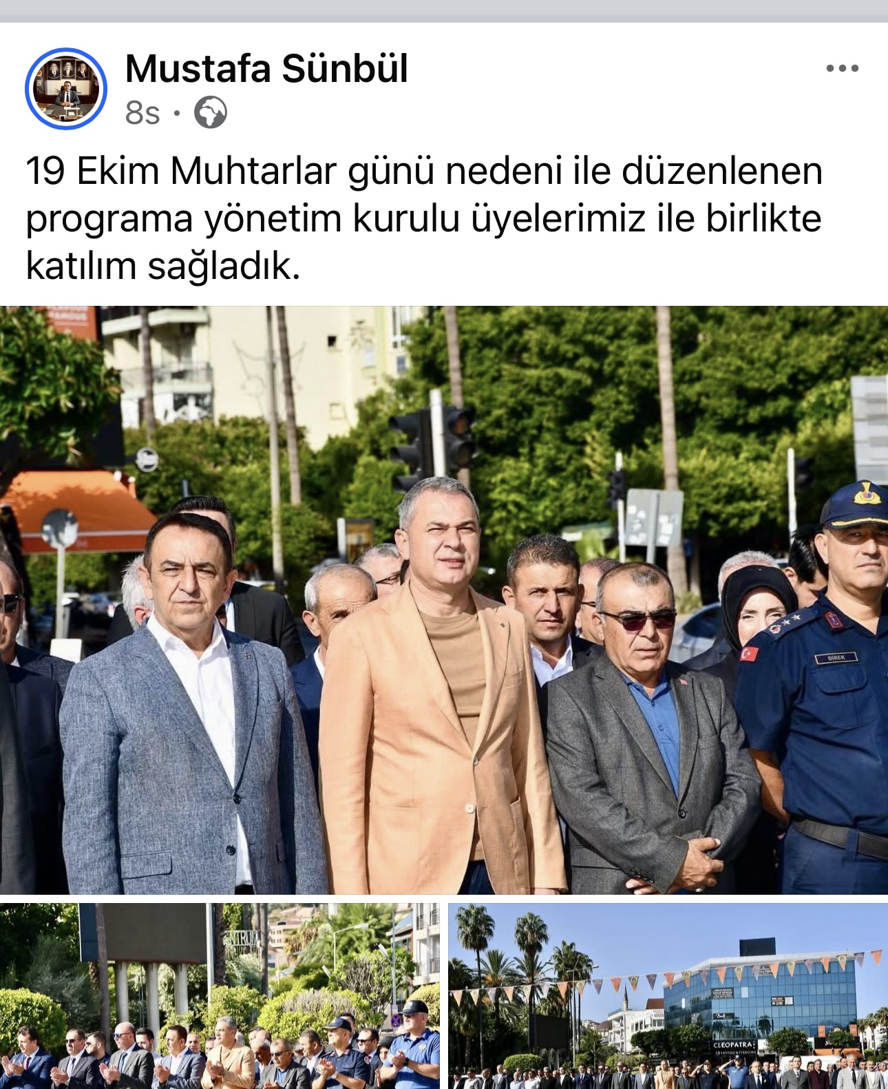 Törene Kaymakam Şakir Öner Öztürk, Alanya Belediye Başkanı Osman Tarık Özçelik, kurum amirleri, siyasi parti temsilcileri, oda başkanları ve mahalle muhtarları katıldı. Program, Atatürk Anıtı’na çelenk sunulması, saygı duruşu ve İstiklal Marşı’nın okunmasıyla başladı. Ardından Muhtarlar Derneği Başkanı Rüştü Vural günün anlam ve önemine ilişkin konuşma yaptı.
