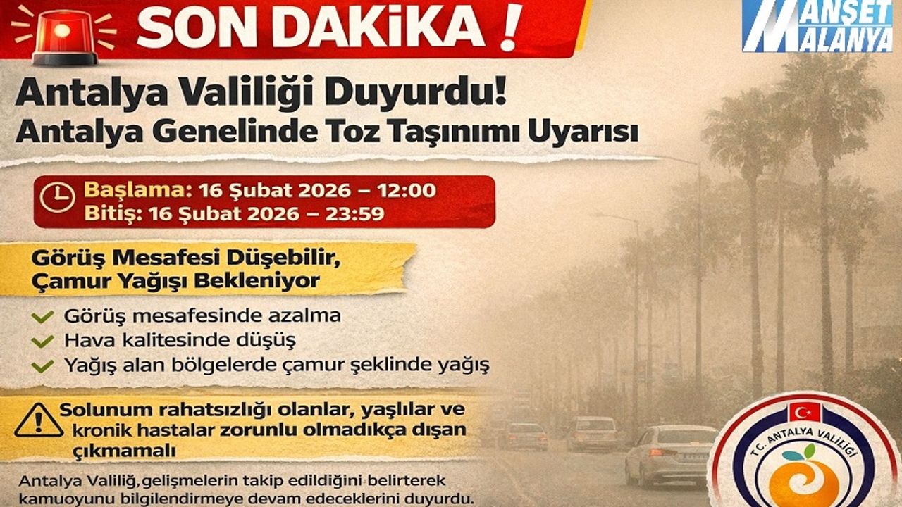 Valilikten yapılan son dakika açıklamasına göre, 16 Şubat 2026 Pazartesi günü saat 12.00’den itibaren il genelinde etkili olması beklenen toz taşınımı nedeniyle vatandaşların dikkatli ve tedbirli olması istendi. Uyarının aynı gün saat 23.59’a kadar geçerli olacağı bildirildi.