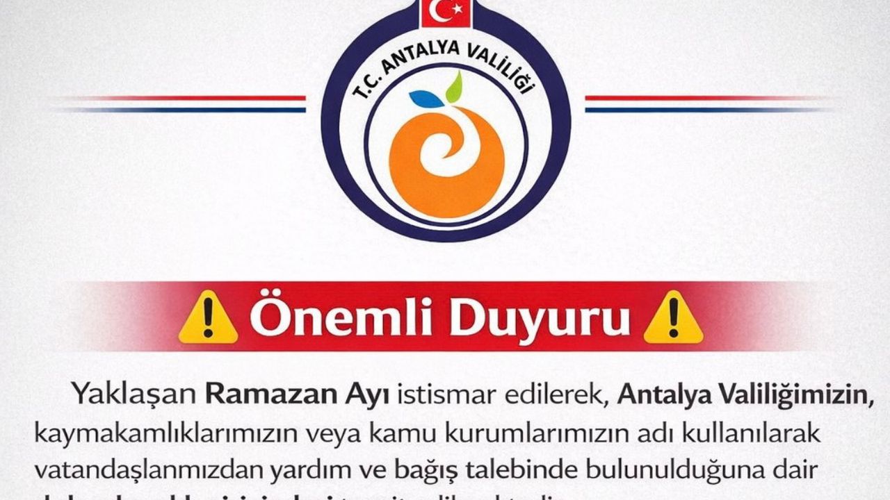 Yapılan açıklamada, Antalya Valiliği, kaymakamlıklar ve bağlı kamu kurumları adına telefon, SMS, sosyal medya mesajları ya da bireysel hesaplar üzerinden yardım ve bağış talebinde bulunulduğuna dair vakaların tespit edildiği belirtildi.