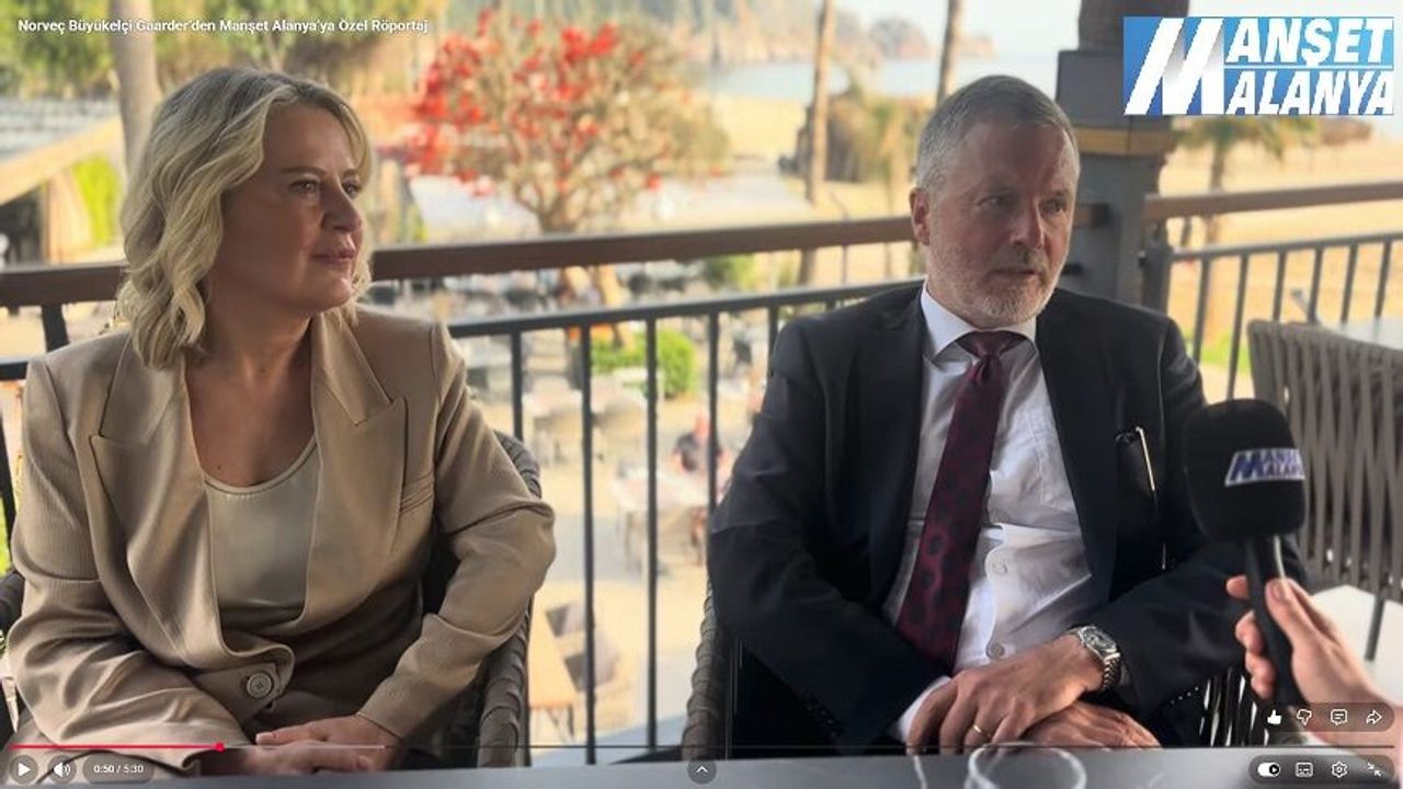 Dünyaca ünlü Kleopatra Plajı ve Alanya Kalesi manzarası eşliğinde gerçekleşen röportajda, Büyükelçi Gaarder’in yanında Norveç Krallığı Alanya Fahri Konsolosu Banu Okan Kavukcu da yer aldı.